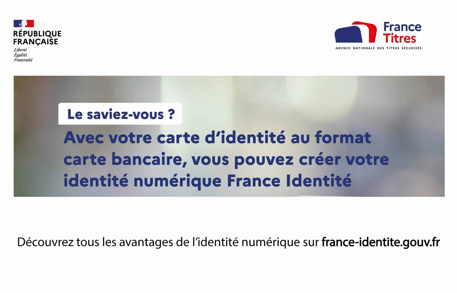Le saviez-vous ? Avec votre carte d‘identité au format carte bancaire, vous pouvez créer votre identité numérique France Identité. C’EST SIMPLE Téléchargez l’application France Identité.