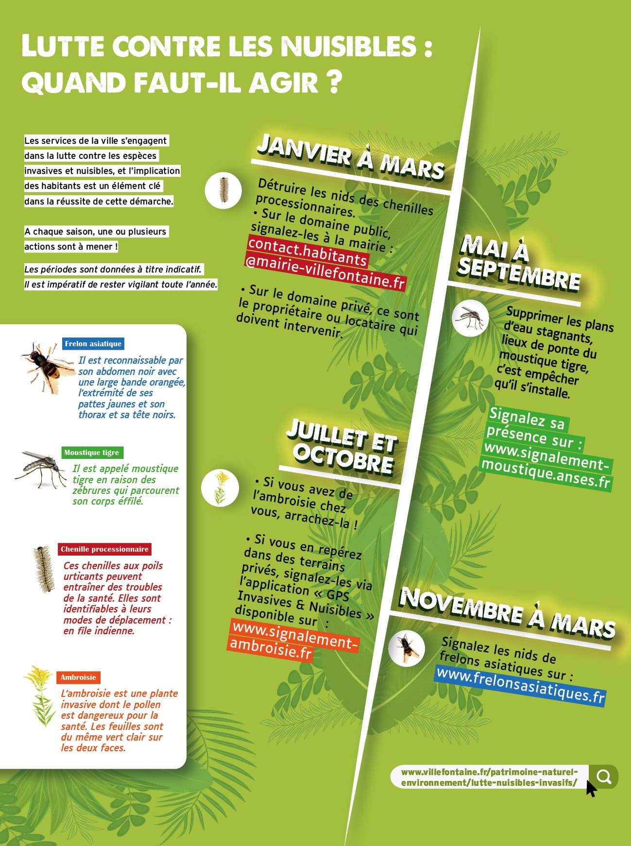 • Si vous repérez des plants d’ambroisie dans des terrains inaccessibles (chantiers …), signalez la zone infestée via l’application disponible sur le site internet : www.signalement-ambroisie.fr. Ce site permet aussi de l’identifier et d’enclencher l’alerte auprès du gestionnaire de l’espace qui a obligation de détruire la plante. Vous pouvez également contacter le 09 72 37 68 88 ou envoyer un mail à l’adresse suivante contact@signalement-ambroisie.fr
